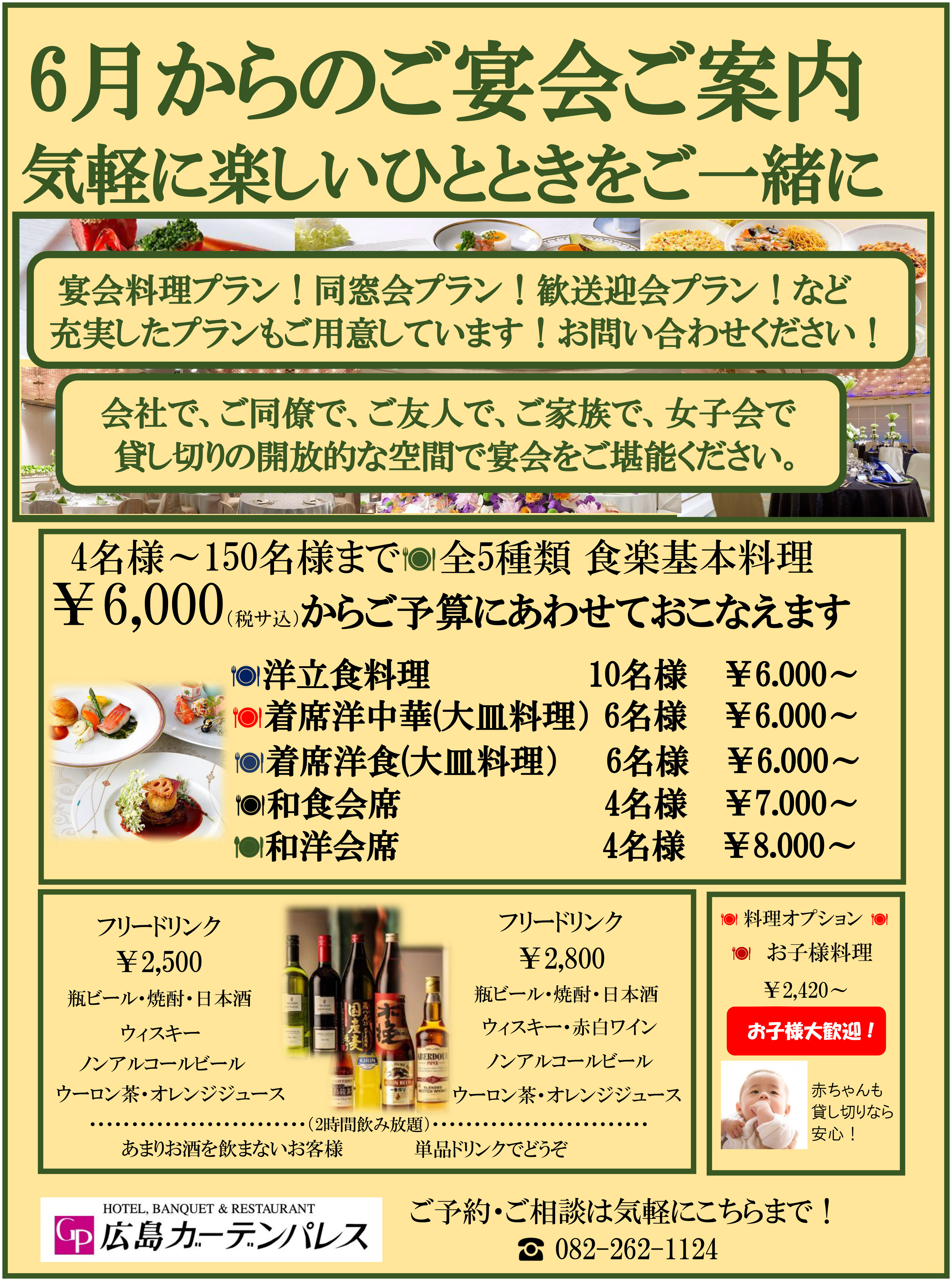 ホーム 新着情報 夏宴 NEWSお知らせ 夏宴 お知らせ 2024年05月11日 期間 夏期限定 料金 ¥6,000(税・サ込)~ 期間 夏期限定 料金 ¥6,000(税・サ込)~ お問い合わせ・資料請求 お電話でのご予約お問い合わせは 広島ガーデンパレス宴会予約係 一覧へ戻る