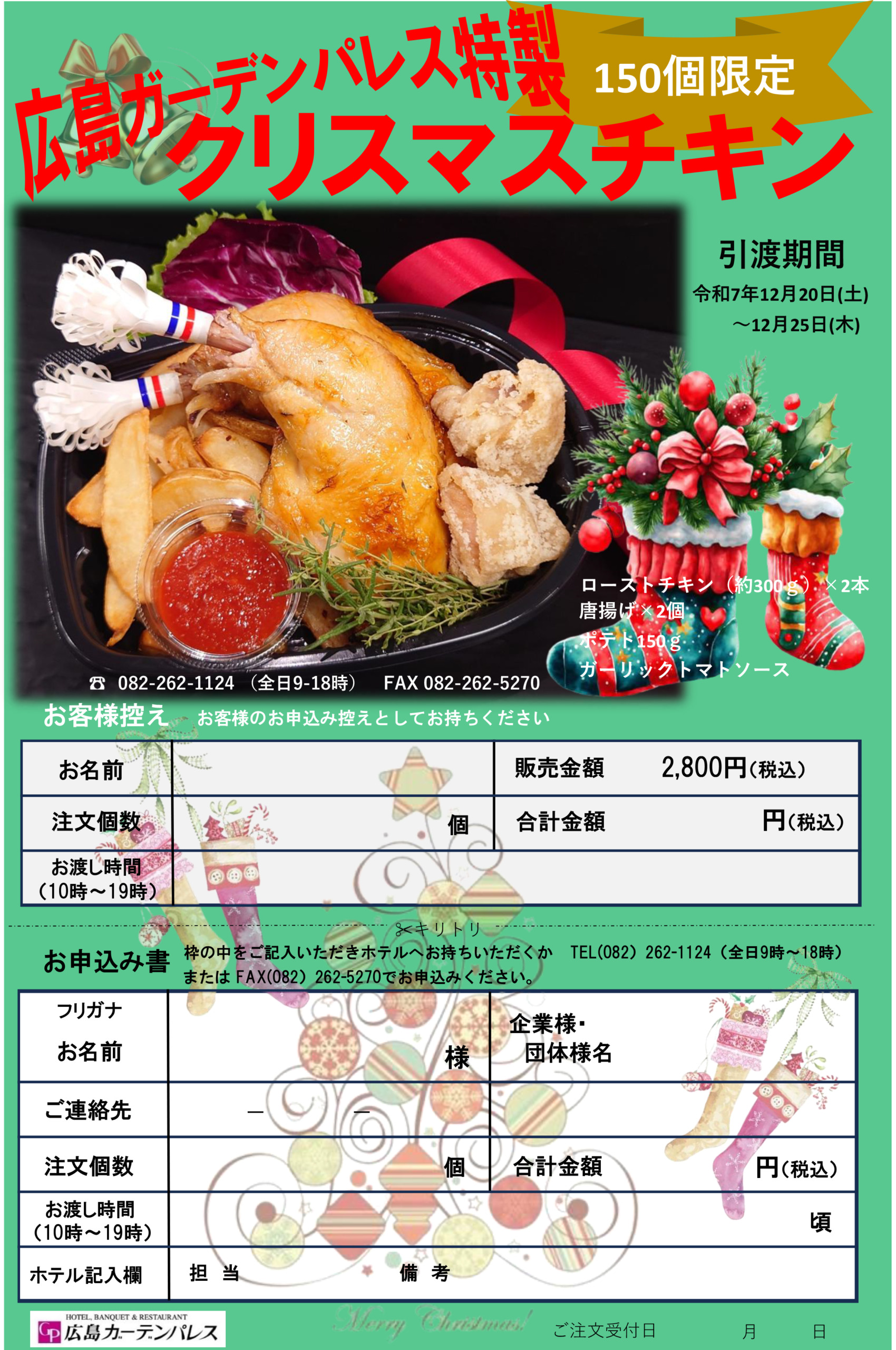 広島ガーデンパレス特製クリスマスチキン予約開始!!